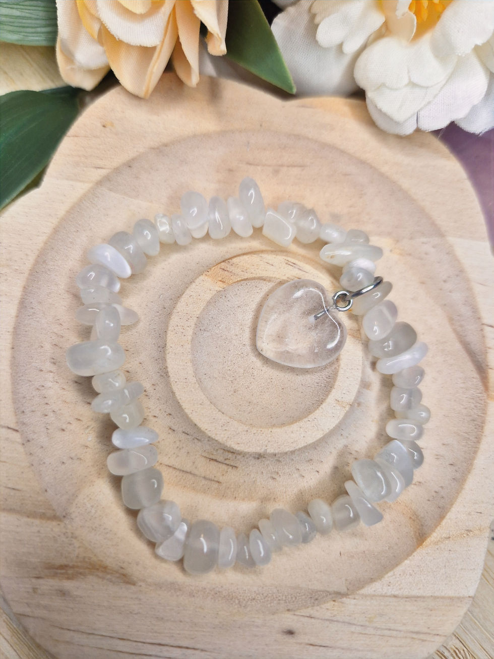 Green Moonstone Chip Bracelet with Clear Quartz Heart